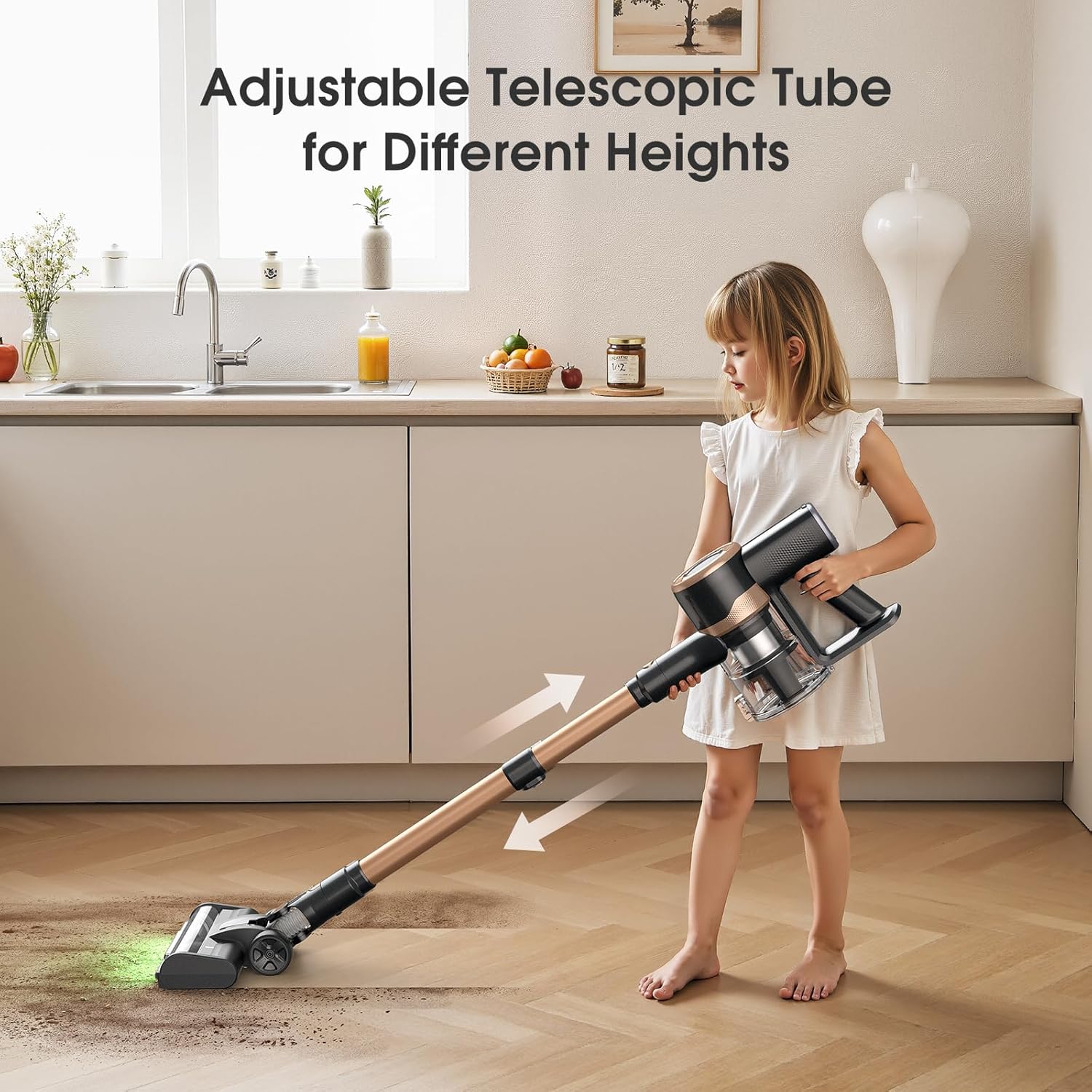- [Lightweight & Space-Saving Design]: This lightweight cordless vacuum cleaner features a self-standing design and adjustable telescopic pipe, allowing you to glide around furniture and reach tight spaces with ease. No wall mount needed—simply set it down anywhere for quick pauses or compact storage.